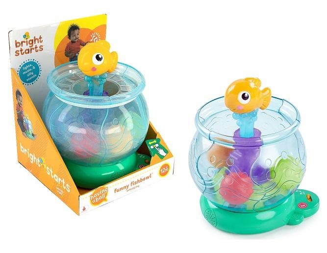 Złota rybka i akwarium wyczarują dziecku cudowną zabawę pełną światełek i wesołych melodii. Wystraczy ustawić przełącznik na tryb zabawnych dźwięków lub melodii i dać się porwać eksplozji radości i zabawy. Naciskaj na rybkę szybciej i szybciej, a akwarium będzie wirować przy dźwiękach wesołych odgłosów lub melodii, świecąc, rozchylając na boki swoje ścianki i wyrzucając kolorowe piłeczki! Złap je wszystkie i wrzuć z powrotem do środka akwarium, aby rozpocząć zabawę od początku