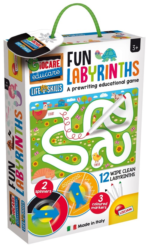 Wyjątkowa gra z 12 labiryntami do pisania i zmazywania, które pomagają wykształcić nawyk pierwszego pisania. Obróć spinner i uzupełnij labirynty używając jednego z trzech pisaków i jednego z wzorów. Dzięki tej grze dziecko rozwija umiejętność rozwiązywania problemów tj. jedną z Life Skills, wyodrębnioną przez WHO. Dla dzieci w wieku od 3 lat