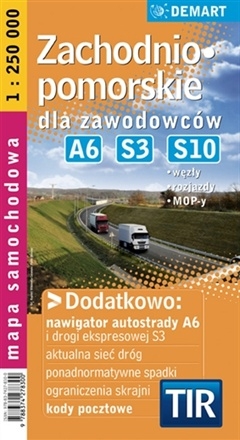 Mapa przeznaczona jest nie tylko dla kierowców zawodowych (TIR-ów, ciężarówek,) ale i dla wszystkich innych kierowców, którzy dużo jeżdżą po Polsce. Ma rozbudowaną treść tematyczną przydatną kierowcom zawodowym: - nawigator autostrady A6, S3, S10 (węzły, rozjazdy, MOP-y) - aktualną sieć dróg - ponadnormatywne spadki z opisem stopnia nachylenia - pionowe i poziome ograniczenia skrajni - spis kodów pocztowych Przedstawiona sieć dróg uwzględnia budowane odcinki: autostrad, dróg krajowych i wojewódzkich przewidzianych do użytku do końca 2013roku. Skala: 1:250 000