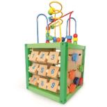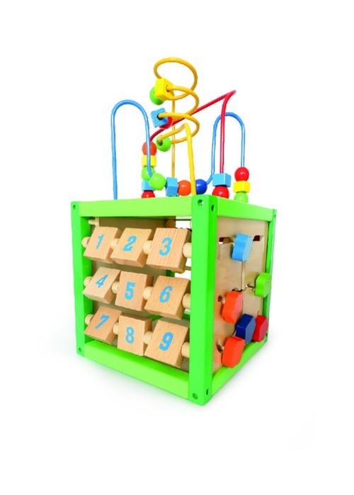 - Pudełka w którym każda ze ścian kryje nową, wciągającą zabawkę: labirynt, liczydło, tablicę, obrotowe klocki z cyferkami i rysunkami zwierząt
