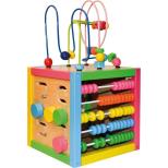 - pudełka, w którym każda ze ścian kryje nową, wciągającą zabawkę: labirynt, liczydło, tablicę, obrotowe klocki z cyferkami i rysunkami zwierząt.