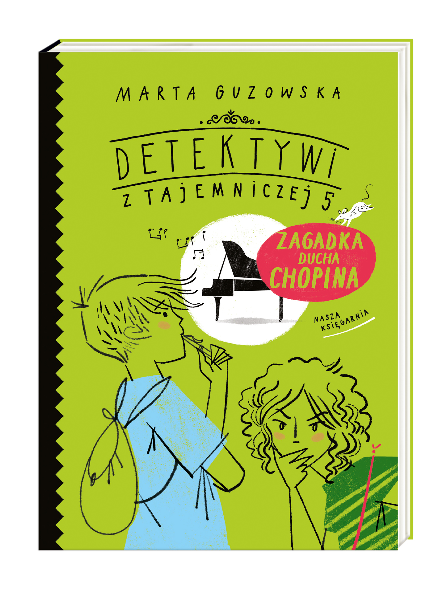 Piąty tom serii detektywistycznej o młodych śledczych z Tajemniczej 5! Anka, Piotrek i Jaga (oczywiście razem ze szczurem Sherlockiem) są na wycieczce w Żelazowej Woli. Piotrek wcale się z tego nie cieszy – uważa, że nie ma nic ekscytującego w zwiedzaniu starego dworku pełnego zakurzonych pamiątek. Szybko jednak zmienia zdanie, gdy w tajemniczych okolicznościach ginie rękopis wielkiego kompozytora, a konserwatorka stwierdza, że list wykradł… duch Chopina. „Detektywi z Tajemniczej 5” zostali wymyśleni na wyraźne życzenie dzieci Marty Guzowskiej – dotąd autorki powieści kryminalnych dla dorosłych. Seria książek o śledztwach Anki i Piotrka łączy przygodową fabułę, elementy wiedzy o nauce i sztuce oraz interaktywną formę, gdyż każdy tom wymaga od czytelnika logicznego myślenia i rozwiązywania zagadek. Marta Guzowska planuje przeżyć dziewięć żyć – jak kot. Na razie ma na koncie trzy: jest archeolożką, pisarką i mamą. Za swoje powieści kryminalne i sensacyjne dla dorosłych otrzymała wiele prestiżowych wyróżnień – między innymi Złoty Pocisk, Czarny Kapelusz oraz Nagrodę Wielkiego Kalibru. „Detektywi z Tajemniczej 5” to jej pierwsza seria książek dla najmłodszych. Według samej autorki „dla dzieci pisze się o wiele trudniej, bo mają detektor ściemy”. Agata Raczyńska jedną ręką głaszcze swoje alpaki, a drugą rysuje. Całe szczęście, że ma dwie ręce i nie musi wybierać… Spośród zilustrowanych przez nią książek z największym uznaniem spotkały się dotąd „Gry i zabawy z dawnych lat” Katarzyny Piętki (2016). Zdobyły wyróżnienie w konkursie PTWK Najpiękniejsze Książki Roku, nominację do Pióra Fredry oraz nominację w konkursie Książka Roku Polskiej Sekcji IBBY.