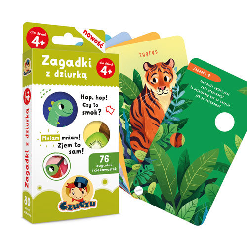 Obrazkowa książeczka porusza wszechstronną tematykę bliską przedszkolakom: zwierzęta, kosmos, dinozaury, ciekawe zawody Zagadki mają formę rymowanych wierszyków. Fragmenty ilustrowanych odpowiedzi (albo zmyłki!) widoczne są przez specjalne dziurki. Odpowiedziom towarzyszą tematyczne zadania lub ciekawostki. W poręcznej książeczce na śrubie znajdziecie 76 zagadek i ciekawostek.