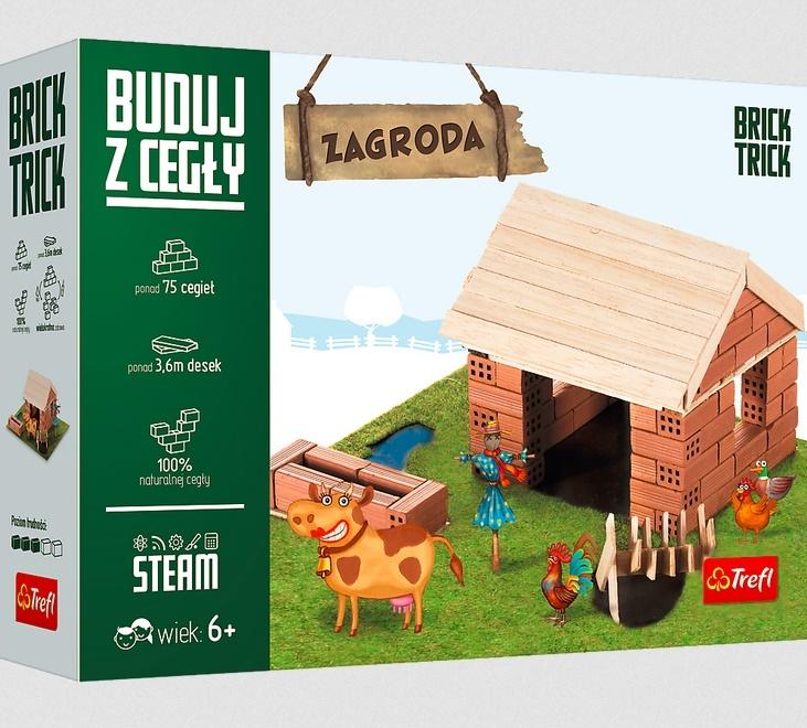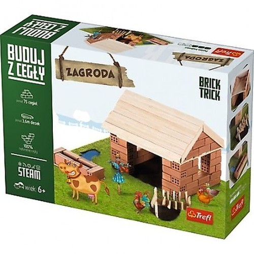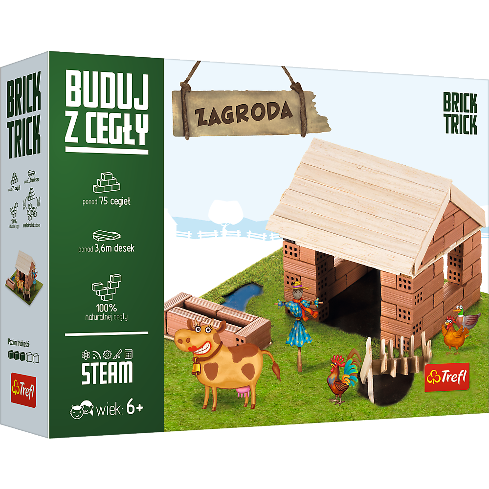 Brick Trick - Zabawa Murowana! Zostań konstruktorem, wykorzystując do budowy prawdziwe cegły i drewno! W instrukcji znajdziesz obszerne ciekawostki prosto z placu budowy. Dowiedz się, jak urozmaicić swoją konstrukcję dzięki wielu interesującym pomysłom i rozwiązaniom. Buduj według instrukcji lub użyj wyobraźni do stworzenia własnej, niepowarzalnej konstrukcji. Możesz też połączyć kilka budynków, tworząc klimat wsi, miasta lub średniowiecza. Wybuduj wesołą zagrodę, wykorzystując prawdziwe cegły, drewno i elementy dekoracyjne. Skorzystaj z dołączonych planów budowy lub użyj wyobraźni do stworzenia niepowtarzalnej konstrukcji. Baw się dołączonymi pionkami prosto z wiejskiego świata! To nie koniec zabawy! Rozpuść konstrukcję w wodzie i buduj dalej wykorzystując ponownie te same cegły! W zestawie znajdziesz: prawdziwe cegły, klej, drewniane deseczki, elementy dekoracyjne, pionki, podstawkę, naklejkę i instrukcję!
