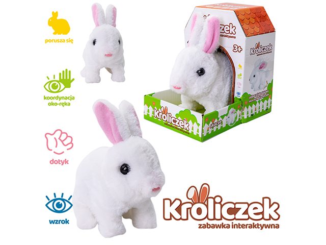 Zajączek radośnie kica, rusza pyszczkiem oraz uszami i ogonkiem, niczym prawdziwy zając.