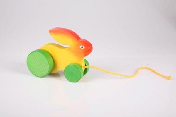 Drewniany zajączek o wymiarach 18 x 7 x 12 cm wraz z sznurkiem do ciągnięcia o długości 30 cm. Zajączek dostępny jest w dwóch kolorach: żółtym i niebieskim. Produkt jest ręcznie malowany. Certyfikat: Produkt posiada znak bezpieczeństwa CE. Surowce używane do ich produkcji posiadają wymagane atesty i spełniają wymogi określone przez Unię Europejską w dyrektywie EN 71.1, EN 71.2, EN 71.3