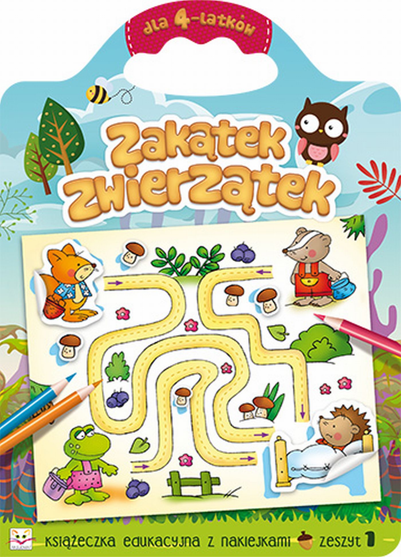 Jeżyk, wiewiórka, żabka i borsuk zapraszają do leśnego przedszkola. Razem z nimi dzieci rozwiązują proste zadania logiczne, porównują wielkości i liczby przedmiotów, ćwiczą spostrzegawczość i poszerzają zasób słownictwa, a poszukując dróg w labiryntach, wykonują pierwsze ćwiczenia w rysowaniu szlaczków i linii. Zabawę z "Zakątkiem zwierzątek" uatrakcyjnią lubiane przez dzieci naklejki.