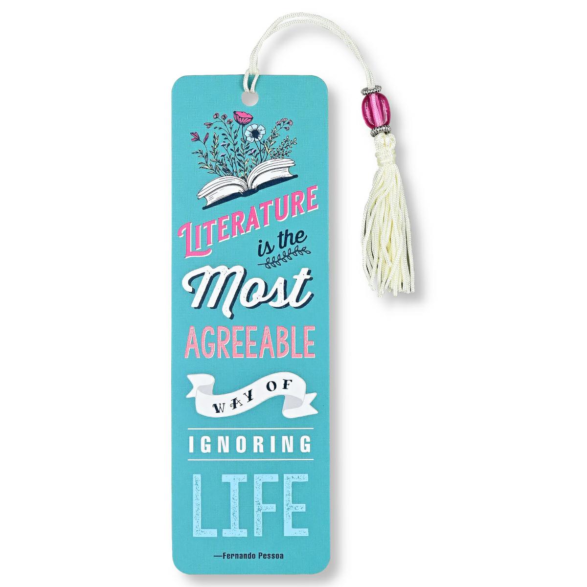 Zakładka do książki firmy Peter Pauper Press - Literatura (Literature Is the Most Agreeable Way of Ignoring Life). Motto: "Literatura jest najprzyjemniejszym sposobem ignorowania życia". Zakładka ma dopasowaną kolorystycznie wstążkę z frędzlem oraz koralik. Barwne, trwałe, zabawne lub motywujące nadruki sprawią, że czytanie będzie jeszcze ciekawsze. Każda zakładka jest drukowana na trwałym, powlekanym kartonie i pakowana w przezroczystą osłonkę. Uniwersalny wymiar 6,4 x 18,1 cm.