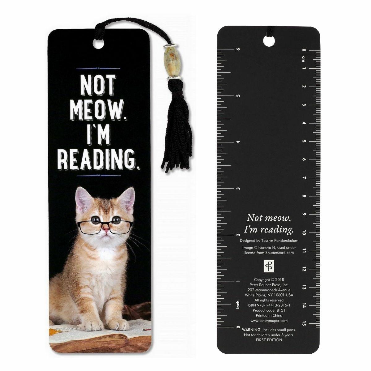 Zakładka do książki firmy Peter Pauper Press - Zajęty Kot (Not Meow. I’m Reading.). "Nie teraz, czytam". Zakładka ma dopasowaną kolorystycznie wstążkę z frędzlem oraz koralik. Barwne, trwałe, zabawne lub motywujące nadruki sprawią, że czytanie będzie jeszcze ciekawsze. Każda zakładka jest drukowana na trwałym, powlekanym kartonie i pakowana w przezroczystą osłonkę. Uniwersalny wymiar 6,4 x 18,1 cm.