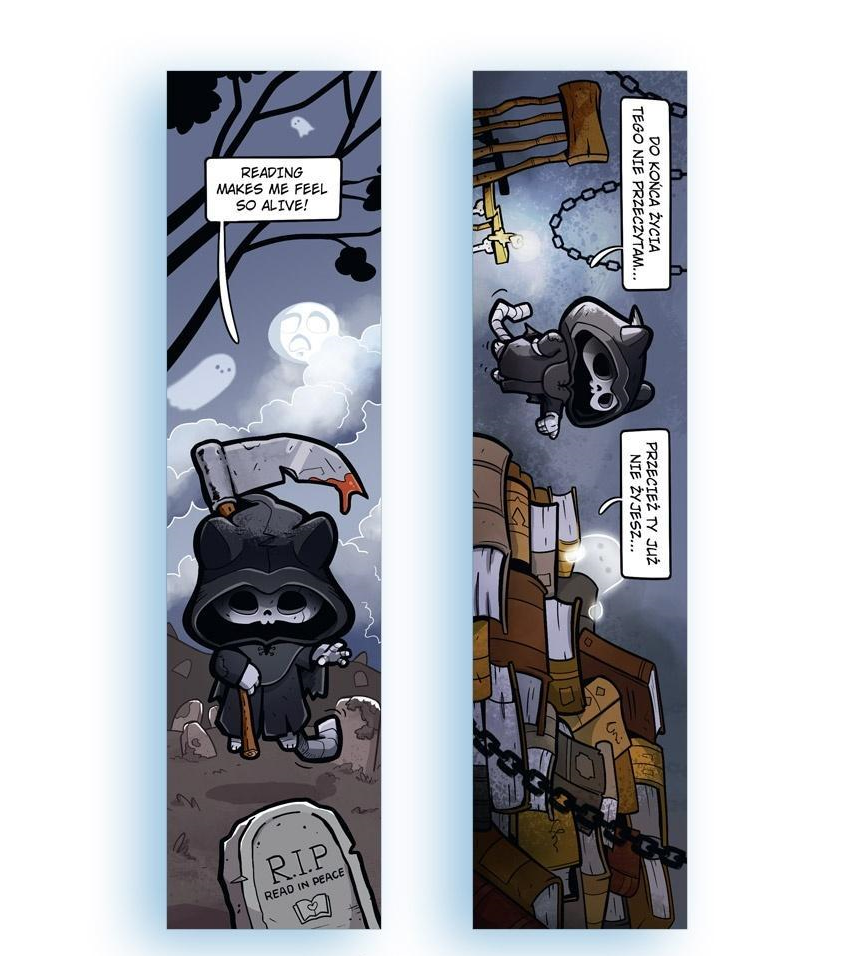 Czytaj z Trupciem przez całą wieczność! Karton ozdobny perłowy 300g, sztywny, metaliczno-srebrny połysk Wymiary: 50x200mm