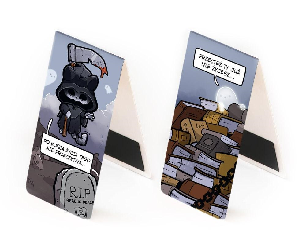 Trupcio pilnuje, byś czytał(a) w pokoju... dosłownie! Sam wie jak to jest mieć książek na całą wieczność! Zaokrąglone rogi, papier kreda 350 g, folia zabezpieczająca błysk, folia magnetyczna na kawałku zakładki