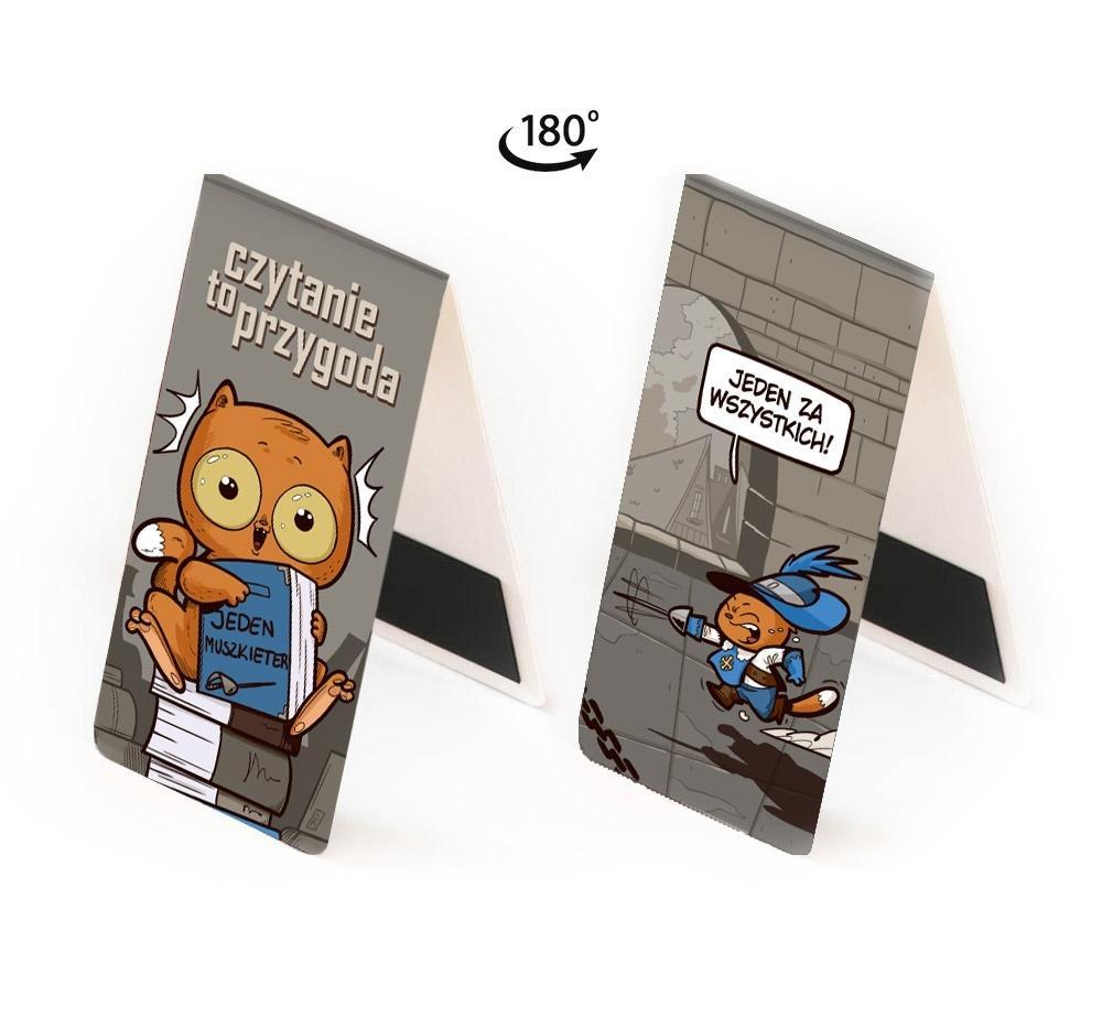Jeden za wszystkich! Nasz kot Muszkieter przypomina o przygodach! Magnetyczna zakładka do książki, która zatrzyma dla Ciebie czas i pozwoli wrócić do niego w każdej chwili. Zaokrąglone rogi, papier kreda 350 g, folia zabezpieczająca błysk, folia magnetyczna na kawałku zakładki