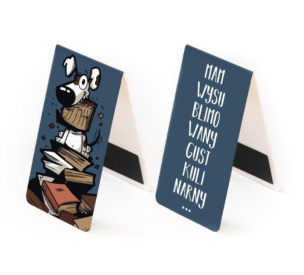 Zakładka do książek dla tych co mają wysublimowany smak i pożerają książki! Zaokrąglone rogi, papier kreda 350 g, folia zabezpieczająca błysk, folia magnetyczna na kawałku zakładki