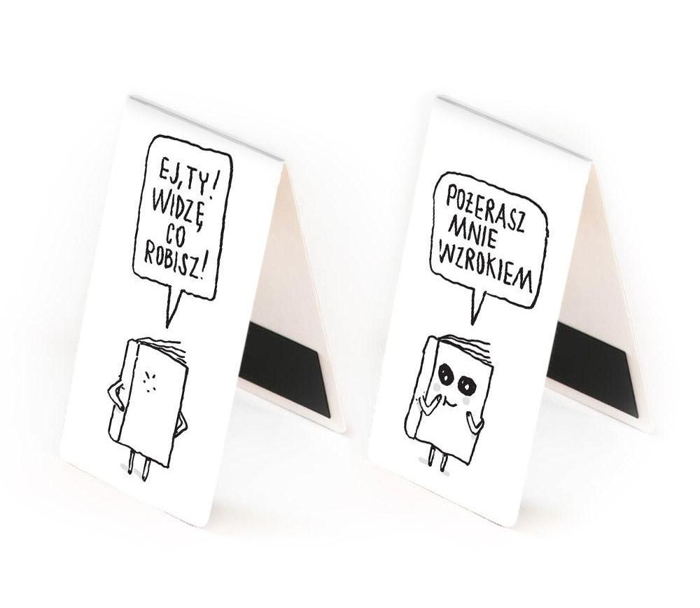 Lubisz przyglądać się książkom? Pożerasz je wzrokiem? ;) To zakładka dla Ciebie! Zaokrąglone rogi, papier kreda 350 g, folia zabezpieczająca błysk, folia magnetyczna na kawałku zakładki