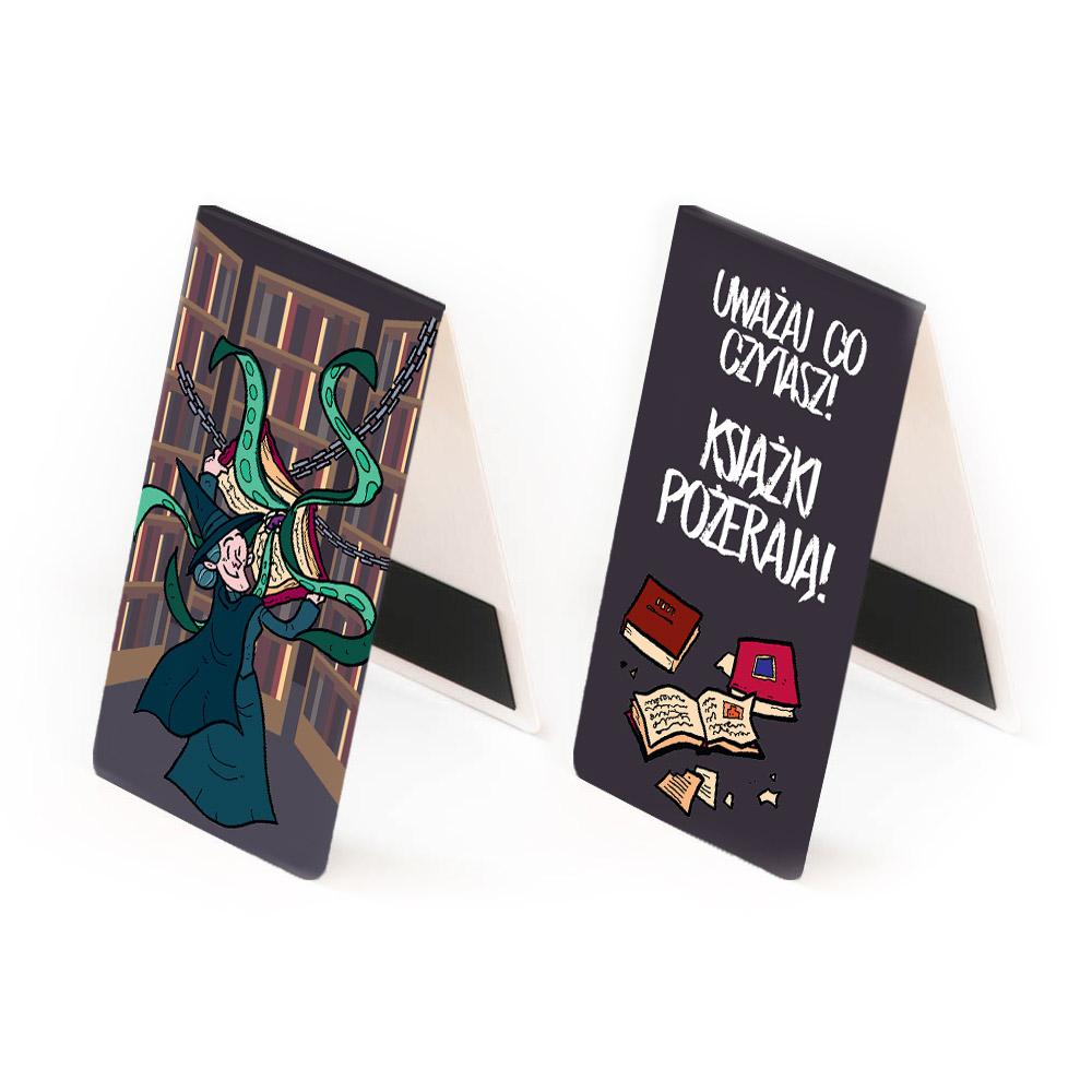 Niektóre książki dosłownie pożerają... może niekoniecznie swych czytelników, ale na pewno ich wolny czas. Uważaj na to, co czytasz i w jakich okolicznościach. Zaokrąglone rogi, papier kreda 350 g, folia zabezpieczająca błysk, folia magnetyczna na kawałku zakładki