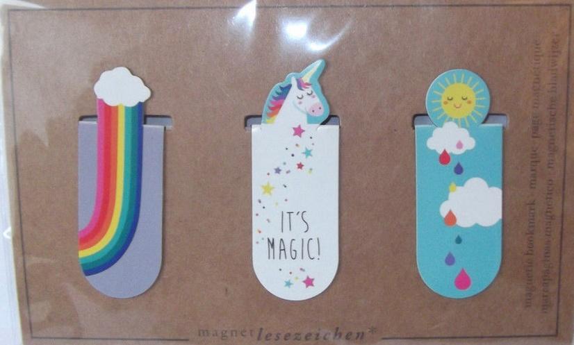Zakładki magnetyczne - Jednorożec. Pięknie ilustrowane zakładki z wystającymi, ozdobnymi elementami. Idealne do zaznaczania ostatnio czytanych lub ulubionych fragmentów książek. Doskonale sprawdzają się w indeksowaniu notatek, dokumentów w biurze, w szkole i w domu. Każdy zestaw zawiera 3 zakładki o różnych wzorach, skoordynowanych tematycznie.