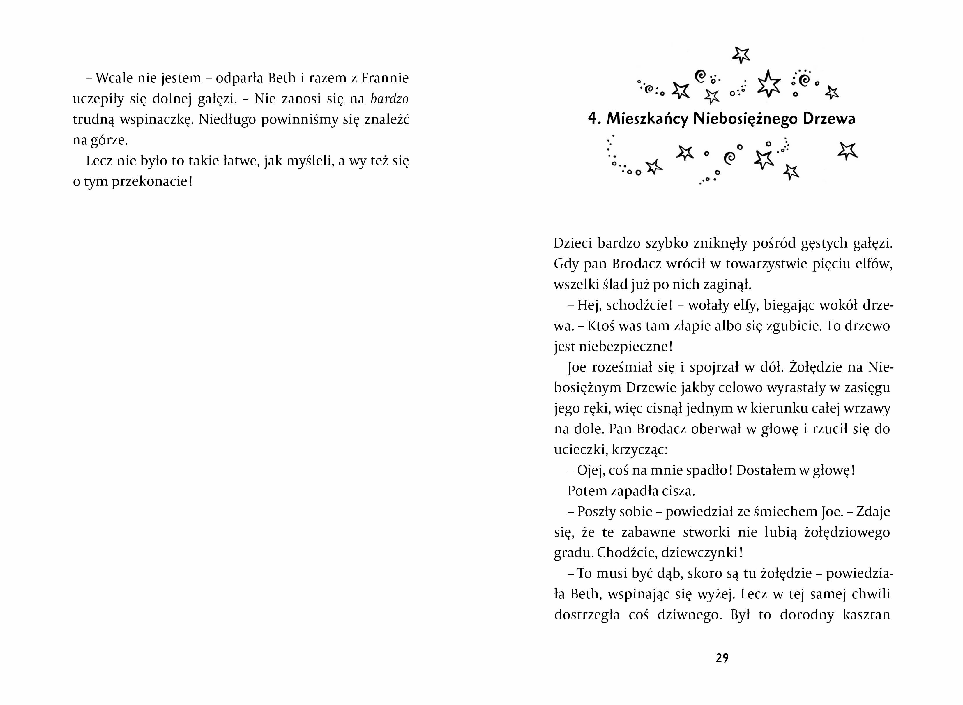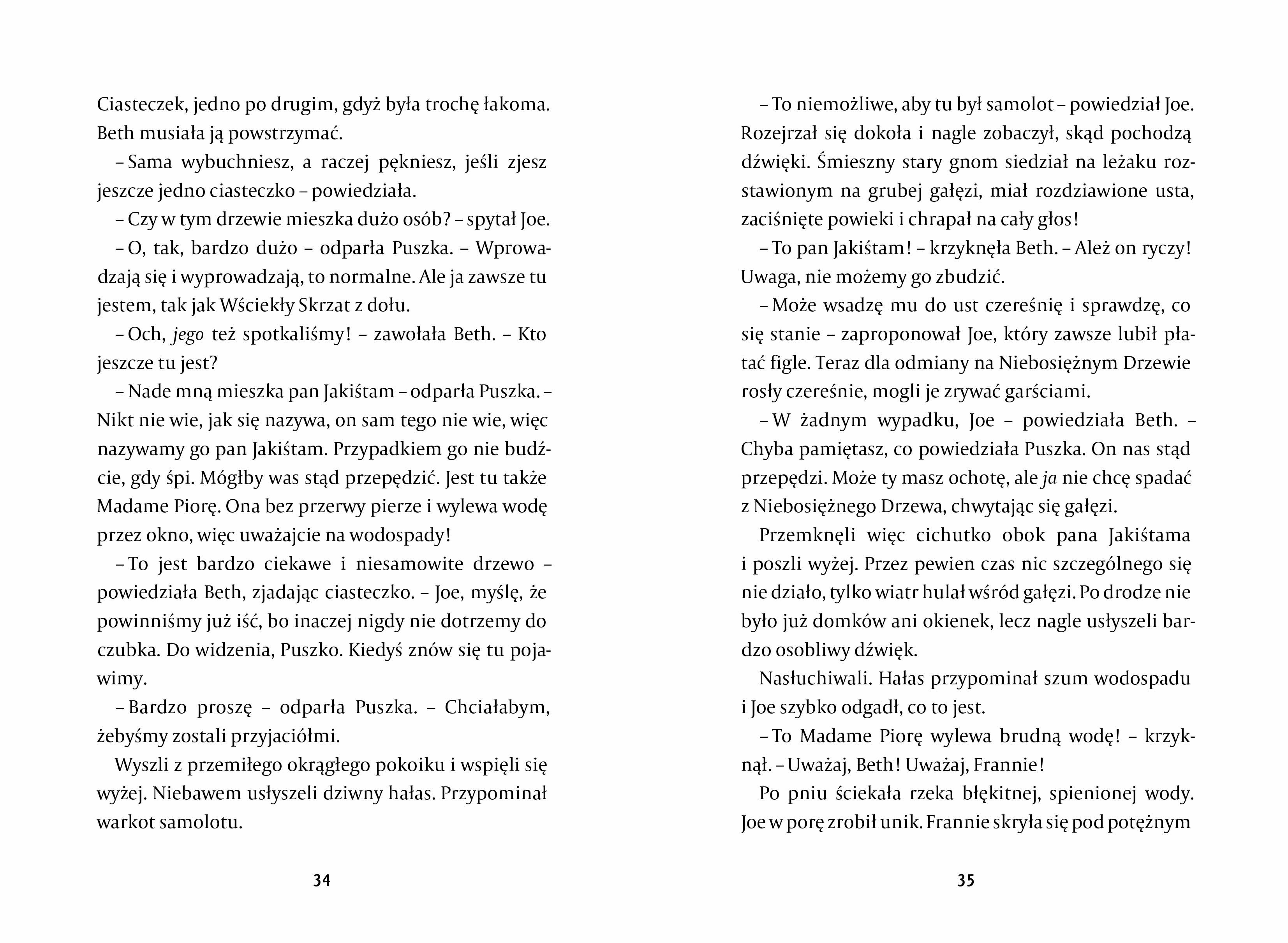 Niebosiężne Drzewo pełne jest nietypowych mieszkańców. Madame Piorę cały czas wylewa na wszystkich brudną wodę z prania. Wróżka Puszka karmi dzieci pysznymi Wybuchowymi Ciasteczkami. A pan Księżyc pozwala im zjechać po ogromnej poduszkowej zjeżdżalni, ale pod warunkiem że wrócą i przyniosą mu toffi. Frannie, Beth i Joe wiedzą, że muszą dotrzymać obietnicy i wspiąć się ponownie na Niebosiężne Drzewo, choć trochę obawiają się tego, do jakiej krainy trafią tym razem.