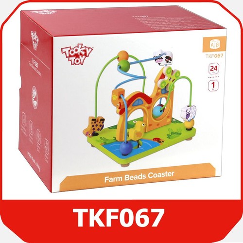 Zakręcona Farma to drewniana zabawka z labiryntami po których przesuwamy barwne koraliki i figurki zwierząt. Na podstawce namalowane jest jeziorko i łąka po której przesuwa się kaczuszka. Budynek farmy ma na dachu obrotowy kwiatek. Na dwóch metalowych pętlach umieszczono drewniane koralki i zwierzątka, które dziecko może dowolnie przesuwać. Koraliki przesuwane po pętlach ćwiczą sprawność dłoni malucha. Zabawki Tooky Toy są bezpieczne. Posiadają certyfikaty ekologicznych produktów. Pozbawione ostrych krawędzi, dobrze wygładzone, pomalowane są nietoksycznymi farbami i lakierami. Wiek: 24 m+