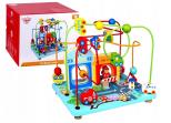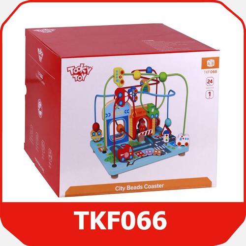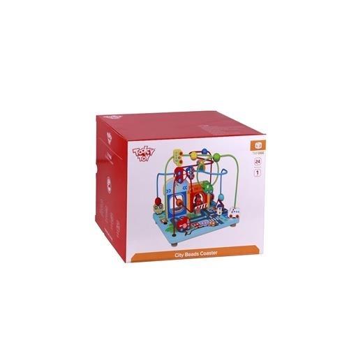 Zakręcone Miasto to drewniana zabawka z labiryntami po których przesuwamy barwne koraliki i figurki pojazdów. Na podstawce namalowane są ulice miasta, po których przesuwają się figurki strażaka i jego wozu. Na trzech metalowych pętlach umieszczono drewniane koralki i zabawne, kolorowe samochodziki, które dziecko może dowolnie przesuwać. Koraliki przesuwane po pętlach ćwiczą sprawność dłoni malucha. Zabawki Tooky Toy są bezpieczne. Posiadają certyfikaty ekologicznych produktów. Pozbawione ostrych krawędzi, dobrze wygładzone, pomalowane są nietoksycznymi farbami i lakierami. Wiek: 24 m+