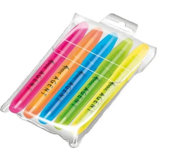 Komplet 5 zakreślaczy. Fluorescencyjny tusz na bazie wody. Intensywne kolory. Precyzyjna ścięta końcówką zakreślającą. Obudowa w kolorze tuszu. Do użytku na wszystkich rodzajach papieru.