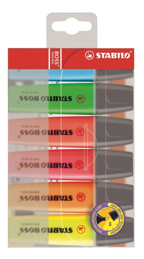 Nr 1 na świecie! Zakreślacz fluorescencyjny z tuszem na bazie wody, do pisania na wszystkich rodzajach papieru (również faksowym i samokopiującym). Duża odporność na wysychanie. Dostępny w 9 kolorach, szerokość linii od 2 do 5 mm. Plastikowe etui z zawieszką zawierające 6 szt. w kolorach: 24, 31, 33, 40, 54, 56.