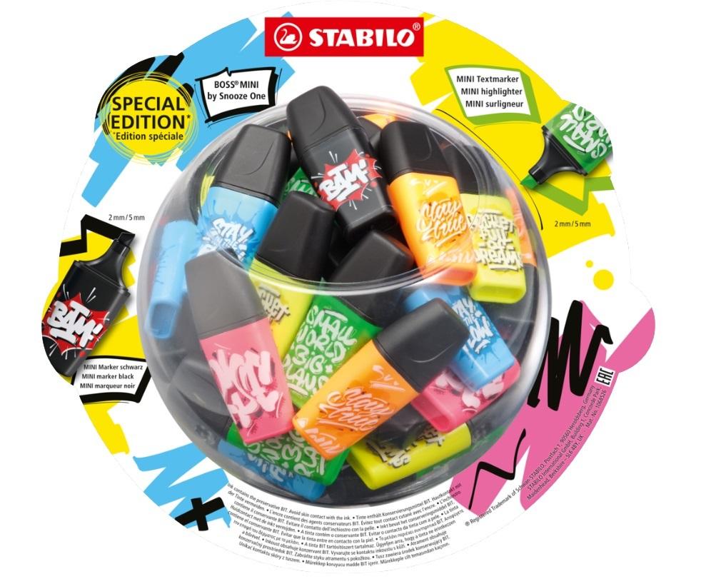 STABILO BOSS MINI by Snooze One to nowa, limitowana edycja popularnego zakreślacza mini w neonowych kolorach. Tym razem jednak do radosnych barw: żółtej, zielonej, pomarańczowej, różowej i niebieskiej dołączył czarny marker w mini formacie, który umożliwia rysowanie wyraźnego konturu oraz tworzenie efektu trójwymiarowego. Tworzenie kolorowych napisów będzie teraz prawdziwą radością! Kartonowy display o wymiarach: 165 mm x 164 mm x 205 mm. Zawartość 50 szt. w 6 kolorach, po 8 szt. w kolorach niebieski, czarny, pomarańczowy, różowy, po 8 szt. w kolorach żółtym i zielonym.