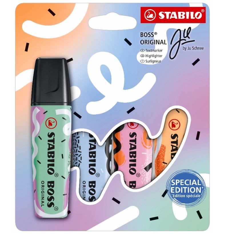 STABILO BOSS ORIGINAL Ju Schnee to pierwsza, limitowana edycja klasycznego zakreślacza. Ozdobne motywy nadrukowane na całej obudowie, zostały zaprojektowane przez młodą artystkę - Ju Schnee. Te wyjątkowe zakreślacze dostępne są w 4 pastelowych kolorach oraz _x000B_w efektownych opakowaniach, które zachęcają do zakupu i wypróbowania ich w akcji. Dzięki nim rysowanie, szkicowanie czy ozdobne pisanie staje się zabawą! Kartonowe etui zawierające 4 szt. zakreślaczy w kolorach pastelowych: zielonym, niebieskim, pomarańczowym, chłodna fuksja.