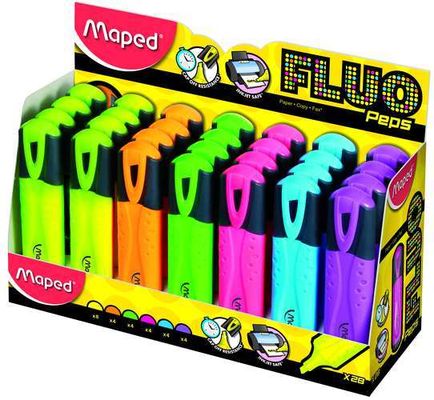 Zakreślacz FLUO PEP'S: Klasyczny kształt obudowy. Perforowane boki zapewniają komfort kreślenia i zapobiegają wyslizgiwaniu się  zakreślacza z dłoni. Tusz odporny na działanie światła - nietoksyczny o wysokiej wydajności i trwałości. Do wszystkich papierów standardowych, samokopiujacych, fotokopii, termopapierów i papierów faksowych.
