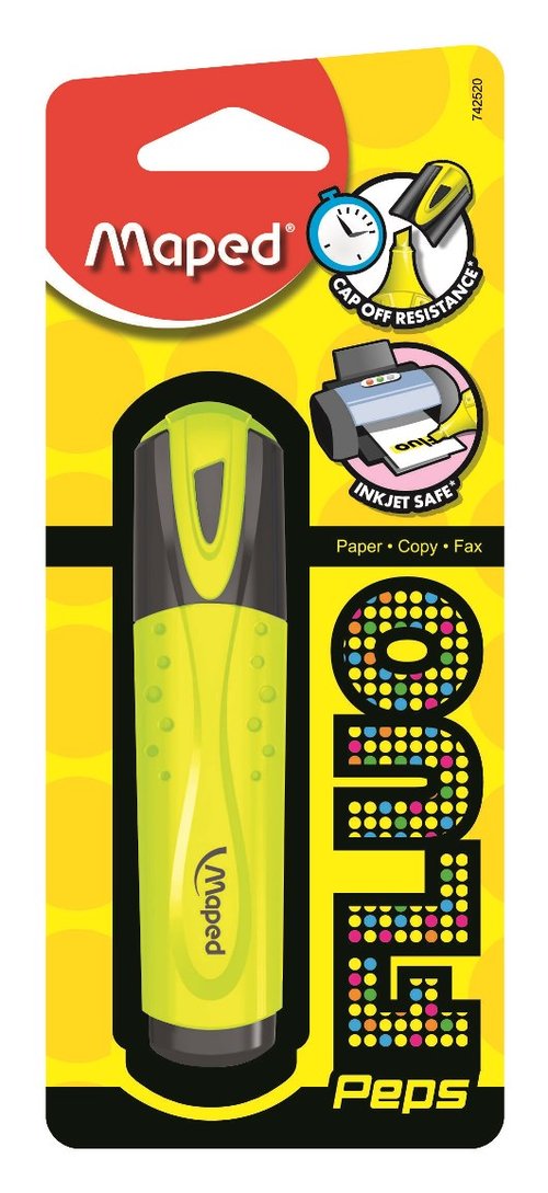 Zakreślacz FLUO PEP'S: Klasyczny kształt obudowy. Perforowane boki zapewniają komfort kreślenia i zapobiegają wyślizgiwaniu się zakreślacza z dłoni.Tusz odporny na działanie światła - nietoksyczny o wysokiej wydajności i trwałości.Do wszystkich papierów standardowych, samokopiujących, fotokopii, termo papierów i papierów faksowych. Pozostawione bez skuwki nawet po 4 godzinach nie tracą swoich właściwości. Ścięta końcówka umożliwia pisanie cienką i grubą linią od 1 do 5 mm. Kolor żółty. JS 1 blister