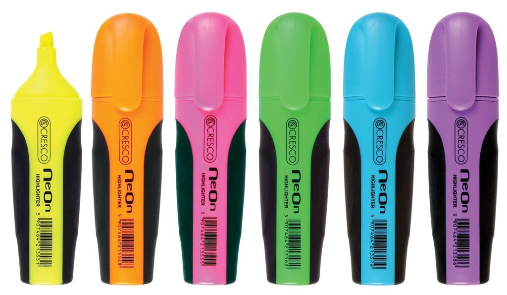 Zakreślacze wielkopojemnościowe, posiadają najwyższej jakości, wysokopigmentowy tusz zapewniający wyraźne i nasycone kolory. Tusz na bazie wody. Zakreślacze doskonale piszą na wszystkich rodzajach papieru. Uchwyt gumowy, profilowany. Końcówka ścięta. Kolory: żółty, zielony, różowy, pomarańczowy, niebieski, fioletowy.