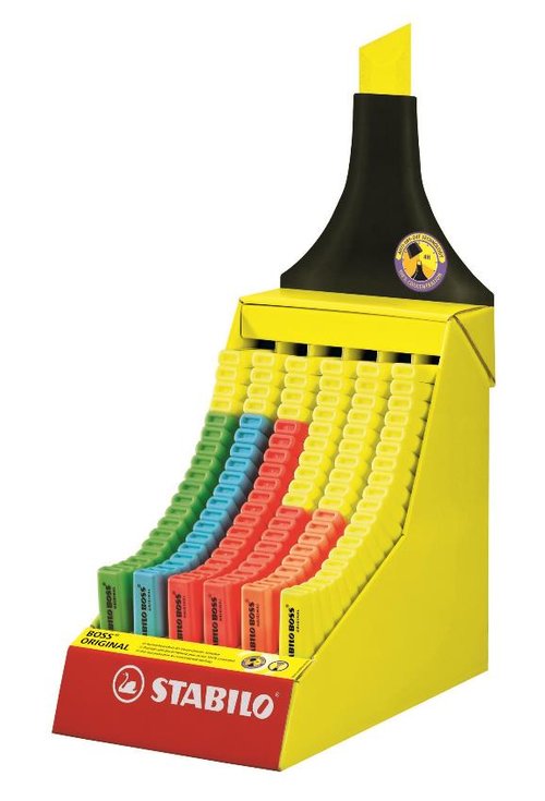 Nr 1 na świecie! Zakreślacz fluorescencyjny z tuszem na bazie wody, do pisania na wszystkich rodzajach papieru (również faksowym i samokopiującym). Duża odporność na wysychanie. Dostępny w 9 kolorach, szerokość linii od 2 do 5 mm. Tekturowy display w kształcie zjeżdżalni o wymiarach: 180x420x270 mm. Zawartość 120 szt. w 6 kolorach: 10 szt.: 40, 54; po 16 szt.: 31, 33, 56; 52 szt. 24.
