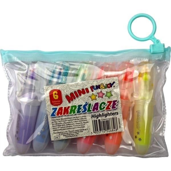 Zestaw 6 zakreślaczy w rozmiarze mini. Okrągła obudowa zamykana przezroczystą skuwką wypełnioną błyszczącymi gwiazdkami w kolorze tuszu. Grubość linii pisania 1-4 mm. Pakowane w praktyczny woreczek na suwak.