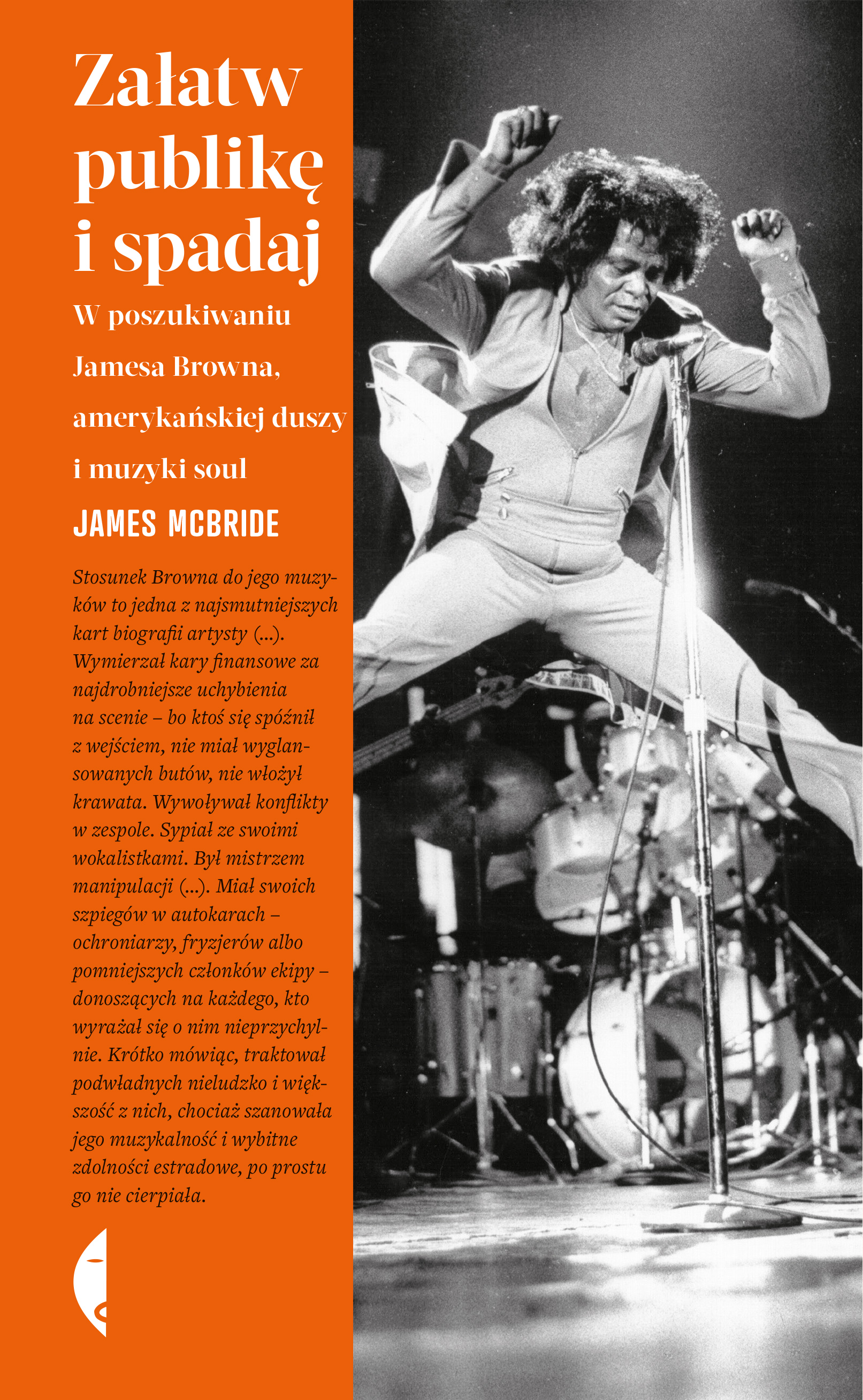 „Najciężej pracujący facet w show-biznesie”, „soulowy brat numer jeden”, „największy demagog w dziejach czarnej rozrywki”. O Jamesie Brownie można powiedzieć wiele. Z jednej strony – jeden z najbardziej charyzmatycznych i utalentowanych muzyków swojego pokolenia, który na zawsze odmienił bieg historii, muzyki i popkultury. Z drugiej – kiepski biznesmen, furiat i twardy szef trzymający krótko swoich pracowników. By opisać jego życie, James McBride zabiera nas w podróż z opustoszałych miasteczek Karoliny Południowej i Georgii do Nowego Jorku. Z lat trzydziestych XX wieku do początków wieku XXI. Historia Browna jest dla McBride’a pretekstem do opowiedzenia losów niezwykłych osób, bez których gwiazda „ojca chrzestnego muzyki soul” nie miałaby szansy świecić tak silnym blaskiem i przez tyle dekad. To również pełna melancholii i nostalgii opowieść o pielęgnowaniu tożsamości i o sztuce pamiętania o swoim pochodzeniu. Książka znalazła się w finale Nagrody Literackiej „Los Angeles Times” oraz zdobyła tytuł jednej z najlepszych książek 2016 roku według National Public Radio. „Wnikliwe spojrzenie na życie jednego z największych i najważniejszych artystów XX wieku, ojca chrzestnego muzyki soul, jedynego i najwspanialszego – Jamesa Browna.” Spike Lee „Niezwykle ważna książka o jednej z najistotniejszych postaci w historii amerykańskiej muzyki i kultury.” „The Boston Globe” „Refleksyjna i dociekliwa, pełna ciepła i doskonałego dowcipu. „Załatw publikę i spadaj” rzuca nowe światło na niezwykłe życie i twórczość Jamesa Browna.” Rick Moody, „The New York Times Book Review” „James McBride, zdobywca Amerykańskiej Nagrody Książkowej za powieść „Ptak dobrego Boga”, okazuje się równie świetnym biografem, jak prozaikiem. To książka, na którą wszyscy czekali. McBride mierzy się w niej z tematem biedy i konfliktów na tle rasowym w kraju, w którym problemy zamiata się pod dywan, a jedynie najsilniejsze głosy mogą być słyszalne.” Boris Kachka, „New York Magazine” „Książka McBride’a jest nieocenionym wkładem w historię R’n’B. To niesamowite, ile James Brown znaczy dla amerykańskiej kultury. Dzięki „Załatw publikę i spadaj” możemy w pełni docenić jego ogromną wartość.” „Los Angeles Review of Books” „McBride nie poucza, tylko opowiada, i to z ogromną pasją. Czytelnicy mogą być wdzięczni za każde zdanie tej książki. Myślę, że nawet James Brown byłby zadowolony z „Załatw publikę i spadaj”.” „USA Today” „Nowatorski i niekonwencjonalny sposób pisania biografii. Za pomocą swojej opowieści McBride uzupełnia wielką lukę w dotychczasowych publikacjach poświęconych Jamesowi Brownowi. Bliżej do życia wielkiego muzyka już nie da się podejść.” David Hajdu, „The Nation” „James McBride dogłębnie analizuje karierę, spuściznę i mity narosłe wokół „ojca chrzestnego muzyki soul” […]. „Załatw publikę i spadaj” to wspaniały i fascynujący portret Jamesa Browna, pokazujący, że zarówno sukcesy muzyka, jak i jego spektakularne porażki miały ogromne znaczenie dla historii amerykańskiej kultury.” „Kirkus Reviews”