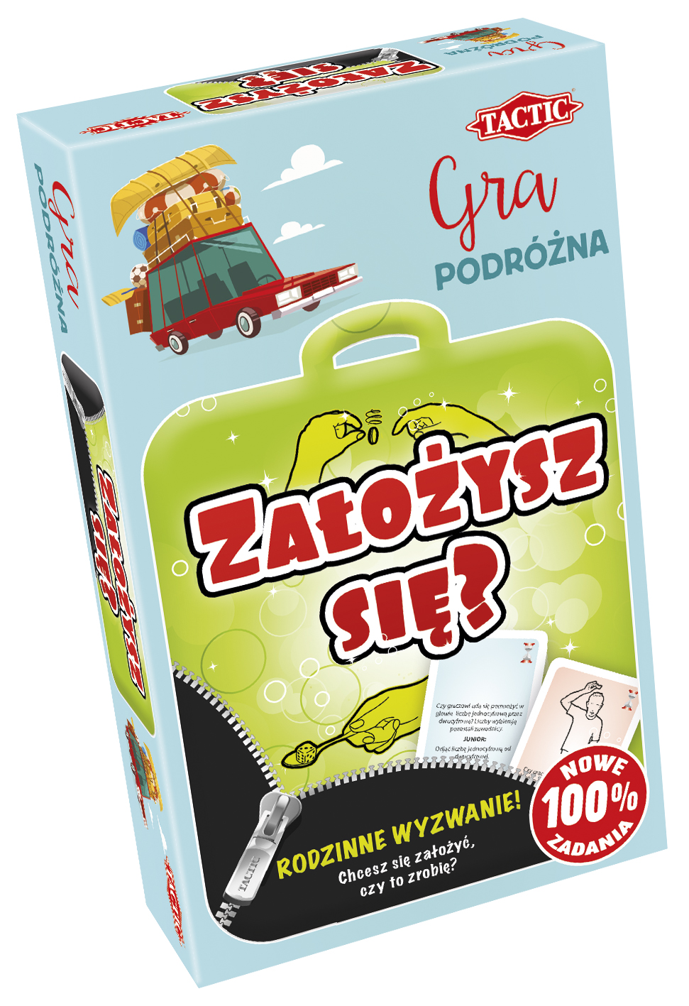 Niespodziewane zwroty akcji! Emocjonujące zakłady! W tej zwariowanej grze imprezowej zawodnicy kolejno wykonują przeróżne zadania, a pozostali gracze obstawiają, czy im się to powiedzie. Zarobek zależy zarówno od trafnego obstawiania, jak i od umiejętności wykonania zadań. Ta gra to po prostu hit! Interakcja między graczami, inne zadanie w każdej kolejce, ekscytujący element obstawiania, prostszy wariant zadań dla młodszych graczy, nieodzowny śmiech wszystko to sprawia, że grą zachwycają się zarówno dorośli, jak i dzieci. Dzięki poręcznemu opakowaniu grę można zabrać, gdziekolwiek się zapragnie.Zawartość: 88 kart zadań (44 zręcznościowe, 44 umysłowe), 12 kart TAK/NIE, 1 bloczek z karteczkami, 1notatnik, 1 klepsydra. Dla 2-4 graczy od 8 lat.