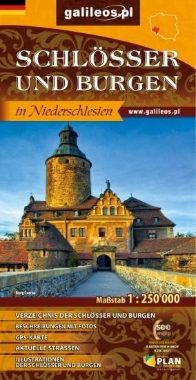Mapa województwa dolnośląskiego w dwóch wersjach językowych (polskiej i niemieckiej). Naniesiono na niej wszystkie zamki, pałace, dwory (z podziałem na w dobrym stanie i zniszczone), wieże mieszkalne i twierdze. Zaznaczono również obiekty, które można zwiedzać i te w których są hotele. Ponad 120 z nich przedstawiono za pomocą ilustracji.