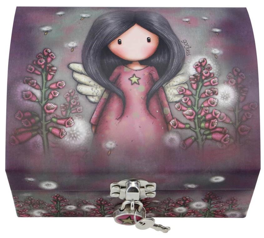 Zamykana Szkatułka - Gorjuss - Little Wings. Urocza szkatułka do przechowywania drobiazgów. Wykonana ze szczególną dbałością, ozdobiona grafiką dziewczynki Gorjuss ze skrzydełkami. Zamykana na ozdobną kłódeczkę. Posiada dwa poziomy: 1 - złożony z czterech sekcji na różne drobiazgi, 2 - na tajne rzeczy. Wspaniały prezent.