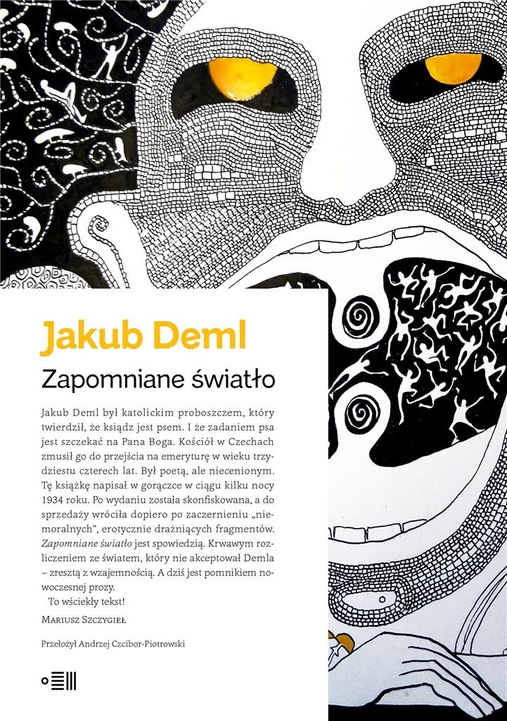 Tę książkę Jakub Deml napisał w gorączce w ciągu kilku nocy w 1934 roku. Po wydaniu została skonfiskowana, a do sprzedaży wróciła dopiero po zaczernieniu „niemoralnych”, erotycznie drażniących fragmentów. To wściekły tekst! Spowiedź. Krwawe rozliczenie ze światem, który nie akceptował autora, zresztą z wzajemnością. A dziś – pomnik nowoczesnej prozy.   Deml był poetą i prozaikiem, jednym z najbardziej oryginalnych pisarzy czeskich XX wieku. Z woli rodziców i za namową znanego poety Otokara Březiny – Jakub zaprzyjaźnił się z nim jeszcze przed maturą – został rzymskokatolickim księdzem. W 1902 roku ukończył seminarium duchowne w Brnie. Jednak proboszcz, który twierdził, że ksiądz jest psem, a zadaniem psa – szczekać na Pana Boga, nie był do zaakceptowania przez hierarchię kościelną; zwłaszcza na katolickich Morawach, gdzie za karę przenoszono go z parafii do parafii. W wieku 34 lat został zmuszony do przejścia na emeryturę z nakazem zamieszkania w Pradze. Na jego życie silny wpływ miały cztery związki z kobietami, które stały się pożywką dla jego twórczości. „Pozorna sensacyjność jest tu jednak sprawą zewnętrzną: istota tych związków opierała się na bliskości myśli, poglądów i celów” – pisze w Historii literatury czeskiej prof. Zofia Tarajło-Lipowska. W 1935 roku Deml poznał 18-letnią Marię Rosę Junovą, która zrezygnowała dla niego ze studiów i przez dwadzieścia cztery lata prowadziła mu dom, pomagając w działalności wydawniczej. Jakub Deml większość swoich dzieł publikował własnym sumptem, w niewielkim nakładzie. Zapomniane światło jest książką gatunkowo trudną do określenia. Licealiści w Czechach uczą się, że to „bolesny strumień krzyku księdza i poety”. Całość jest rozmową Demla z poetą B.M. Ptáčkiem, a jednocześnie opowieścią o umieraniu na gruźlicę wiejskiej parafianki Demla oraz polemiką ze światem. Książkę bardzo cenił Bohumil Hrabal i uważał ją za idealny zapis strumienia świadomości. Pisano o Demlu, że był mściwy i histeryczny, a z przeciwnikami i sprawcami życiowych rozczarowań zawsze rozliczał się bezpardonowo. Skutkowało to izolacją pisarza i odwróceniem się od niego przyjaciół. Jedynym, który został przy nim do końca swych dni, był Březina. W 1931 roku Jakub Deml napisał głośną książkę Moje świadectwo o Otokarze Březinie, która wywołała wojnę między nim a czeskim światem literackim. Zrzucił bowiem metafizycznego poetę z piedestału, pokazując go z nie najlepszej strony, łącznie z jego antysemityzmem – zresztą o własnym też nie zapomniał. Zapomniane światło to również reakcja na antydemlowską kampanię wielbicieli Březiny. Do Zapomnianego światła, którego pierwsze polskie wydanie ukazało się w 2000 roku, dodajemy esej Jindřicha Chalupeckiego z książki o czeskich ekspresjonistach. „Przyjaźń Březiny z Demlem była tym mocniejsza, że ukryty był w niej także motyw miłosny – pisze Chalupecký. – W życiu Březiny pojawia się młodziutki Jakub Deml, ze swym niemal dziewczęcym wyglądem (Florian w swych dziennikach nazywa go ironicznie »hermafrodytą«), ze swym poetyckim geniuszem i z entuzjastycznym uwielbieniem. Z nikim Březina nie będzie się czuł tak blisko związany”. Uważał, że Deml był „jednym z tych wspaniałych ludzi, w bliskości których otwierają się ukryte źródła serca i wypowiedzenie wszystkiego – także tego, do czego się nawet przed sobą nie przyznaliśmy”. „Po co dziś czytać Demla? – zastanawia się Mariusz Szczygieł, autor serii literatury czeskiej Stehlík, w której ukazuje się książka. - Choćby po to, aby się przekonać, że wszystkie źle społecznie widziane cechy, takie jak nieustępliwość, wybujały egotyzm, kłótliwość, czy przekonanie o własnej nieomylności mogą być podłożem wybitnej literatury. A poza tym ksiądz, który szczeka na Pana Boga, jest zawsze ciekawy”.