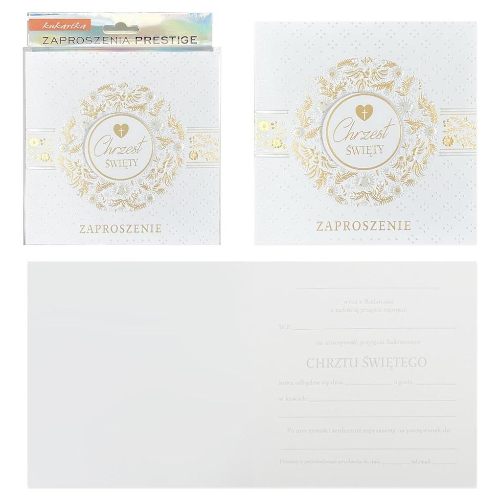 Zaproszenie Premium na chrzest ZP-048 Zaproszenia z serii Premium ZP wyróżniają się elegancją i wyjątkowym opakowaniem. Zdobienia w zależności od wzoru zawierają dekoracyjne elementy doklejane - perełki, kokardki, akcenty biżuteryjne; tłoczenia oraz przynajmniej dwie uszlachetnienia, takie jak folia perłowa lub holograficzna albo delikatny brokat. Zaproszenia pakowane są po 5 sztuk, mają w zestawie dopasowane koperty, a na specjalnej wkładce z tyłu można przeczytać tekst zaproszenia. Cechy szczególne: typ produktu: zaproszenie na chrzest zdobienia: doklejane elementy dekoracyjne, tłoczenie przestrzenne, przynajmniej dwa uszlachetnienia z folii lub brokatu, orientacyjna wielkość: 14,5 x 14,5 w opakowaniu: 5 sztuk zaproszeń z dopasowanymi kopertami, okazja: Chrzest