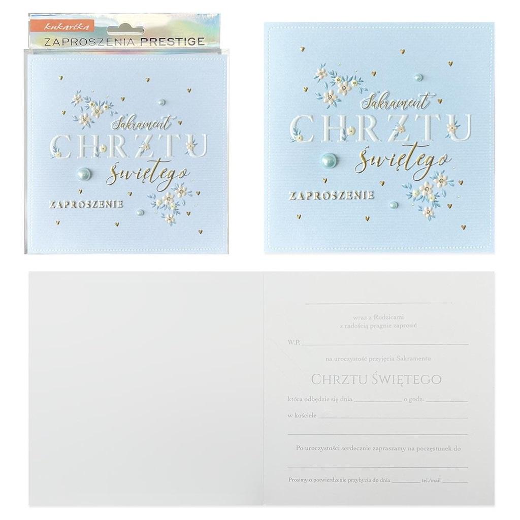 Zaproszenie Premium na chrzest ZP-048 Zaproszenia z serii Premium ZP wyróżniają się elegancją i wyjątkowym opakowaniem. Zdobienia w zależności od wzoru zawierają dekoracyjne elementy doklejane - perełki, kokardki, akcenty biżuteryjne; tłoczenia oraz przynajmniej dwie uszlachetnienia, takie jak folia perłowa lub holograficzna albo delikatny brokat. Zaproszenia pakowane są po 5 sztuk, mają w zestawie dopasowane koperty, a na specjalnej wkładce z tyłu można przeczytać tekst zaproszenia. Cechy szczególne: typ produktu: zaproszenie na chrzest zdobienia: doklejane elementy dekoracyjne, tłoczenie przestrzenne, przynajmniej dwa uszlachetnienia z folii lub brokatu, orientacyjna wielkość: 14,5 x 14,5 w opakowaniu: 5 sztuk zaproszeń z dopasowanymi kopertami, okazja: Chrzest