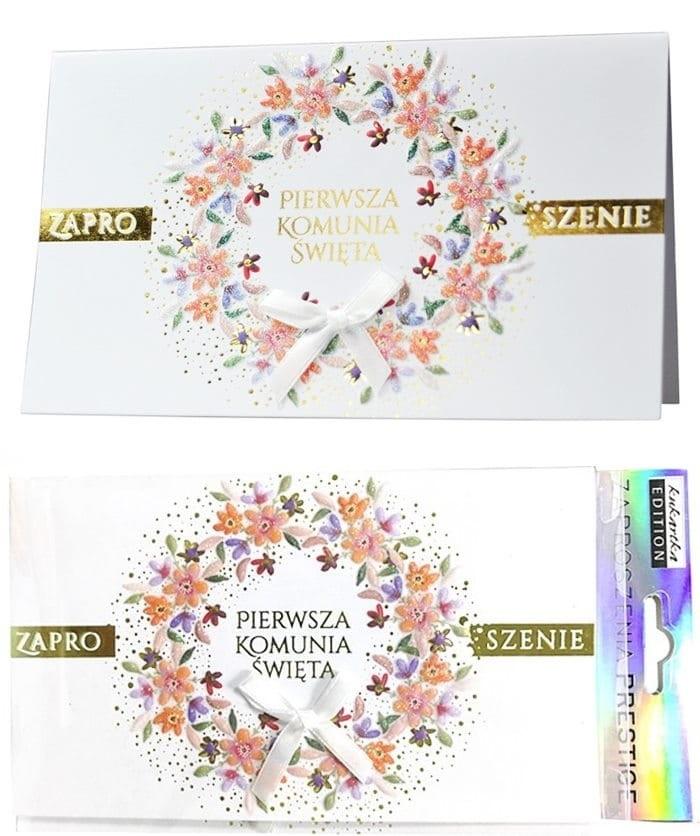 Zaproszenie Premium na Komunię ZP-004 Kukartka Zaproszenia z serii Premium ZP wyróżniają się elegancją i wyjątkowym opakowaniem. Zdobienia na każdym zaproszeniu zawierają dekoracyjne elementy doklejane - perełki, kokardki, akcenty biżuteryjne; tłoczenia oraz przynajmniej dwie uszlachetnienia, takie jak folia perłowa lub holograficzna albo delikatny brokat. Pomimo bogatego zdobienia, zaproszenia ZP są przede wszystkim eleganckie i wysmakowane. Efekt ten podkreśla opakowanie - kartonik z mocnego PCV. Zaproszenia pakowane są po 5 sztuk, mają w zestawie dopasowane koperty, a na specjalnej wkładce z tyłu można przeczytać tekst zaproszenia. Cechy szczególne: typ produktu: zaproszenie na Komunię, materiał: śnieżnobiały papier ozdobny, zdobienia: doklejane elementy dekoracyjne, tłoczenie przestrzenne, przynajmniej dwa uszlachetnienia z folii lub brokatu, orientacyjna wielkość: 16,5 x 10 cm opakowanie: elegancki kartonik z PCV, w opakowaniu: 5 sztuk zaproszeń z dopasowanymi kopertami, okazja: Komunia