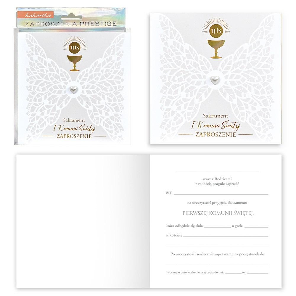 Zaproszenie Premium na Komunię ZP-053 Zaproszenia z serii Premium ZP wyróżniają się elegancją i wyjątkowym opakowaniem. Zdobienia w zależności od wzoru zawierają dekoracyjne elementy doklejane - perełki, kokardki, akcenty biżuteryjne; tłoczenia oraz przynajmniej dwie uszlachetnienia, takie jak folia perłowa lub holograficzna albo delikatny brokat. Zaproszenia pakowane są po 5 sztuk, mają w zestawie dopasowane koperty, a na specjalnej wkładce z tyłu można przeczytać tekst zaproszenia. Cechy szczególne: typ produktu: zaproszenie na Komunię zdobienia: doklejane elementy dekoracyjne, tłoczenie przestrzenne, przynajmniej dwa uszlachetnienia z folii lub brokatu, orientacyjna wielkość: 14,5 x 14,5 cm w opakowaniu: 5 sztuk zaproszeń z dopasowanymi kopertami, okazja: Komunia