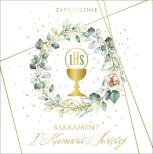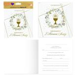 Kartka wielkości B6, zdobiona w zależności od wzoru metaliczną folią lub brokatem. Każda kartka posiada kolorowe życzenia w środku i dopasowaną kopertę w komplecie.