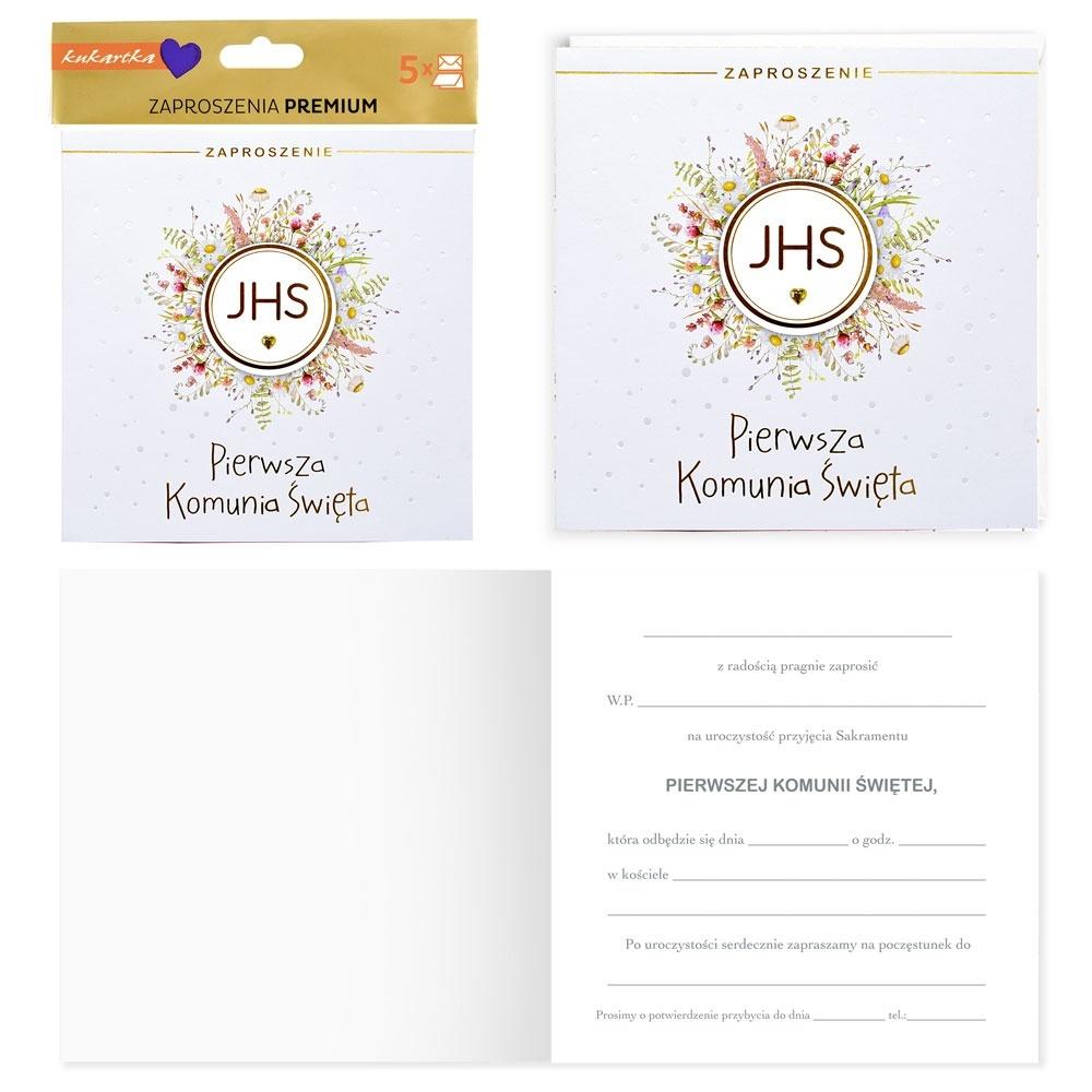 Zaproszenie na I Komunię Świętą Passion Moments Kukartka PMZ-132 Zaproszenie z serii Passion Moments PMZ to idealne połączenie stylu i przystępnej ceny. Zaproszenia PMZ drukowane są na satynowym, śnieżnobiałym papierze, a każde posiada przynajmniej dwa uszlachetnienia: złocenie lub srebrzenie, elementy z perłowej lub holograficznej folii itp. W opakowaniu znajduje się 5 zaproszeń i 5 dopasowanych do nich kopert. Cechy szczególne: opakowanie: woreczek zawierający 5 sztuk zaproszeń z kopertami, zdobienia: przynajmniej dwa: złocenie, srebrzenie, perłowa lub holograficzna folia, wymiary po złożeniu: 15,5 x 15,5 cm okazja: Komunia