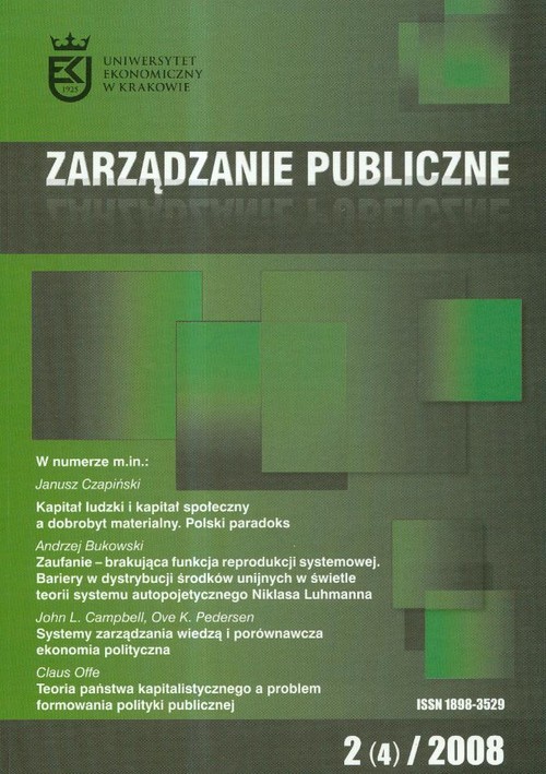 Kapitał ludzki i kapitał społeczny a dobrobyt materialny. Polski paradoks Zaufanie - brakująca funkcja reprodukcji systemowej. Bariery w dystrybucji środków unijnych w świetle teorii systemu autopojetycznego Niklasa Luhmanna Systemy zarządzania wiedzą i porównawcza ekonomia polityczna