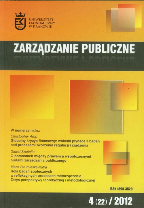 Spis treści [Contents] Dawid Sześciło: O pomostach między prawem a współczesnymi nurtami zarządzania publicznego [About bridges between law and public management concepts], doi 10.7366/1898352942201, s. 5–17; Marta Strumińska-Kutra: Rola badań społecznych w refleksyjnych procesach metarządzenia. Zarys perspektywy teoretycznej i metodologicznej [The role of social research in reflexive metagovernance. Theoretical and methodological perspective], doi doi 10.7366/1898352942202, s. 17–29; Jan Kaźmierski: Administracja publiczna jako katalizator rozwoju klastrów w gospodarce regionalnej [Public administration as a catalyst for cluster development], doi doi 10.7366/1898352942203, s. 30–41; Artur Molenda: Medialny wizerunek administracji rządowej. Analiza zagadnienia na podstawie wybranych artykułów prasowych opublikowanych w Gazecie Wyborczej i Rzeczpospolitej w pierwszym kwartale 2011 r. [Media image of the government administration. Analysis of the issue of published articles on the base chosen in Gazeta Wyborcza and Rzeczpospolita in the first quarter of 2011], doi 10.7366/1898352942204, s. 42–51; Grażyna Piechota: Zarządzanie procesem komunikowania w mediach społecznościowych przez miasta Metropolii Silesia i ich prezydentów [Managing of communication processes in social media by the cities of Metropolitan Association of Upper Silesia and their majors], doi 10.7366/1898352942205 , s. 52–67. Wybór tekstów klasycznych [Selection of classic text] Christopher Arup: Globalny kryzys finansowy: wnioski płynące z badań nad procesami tworzenia regulacji i rządzenia [The global financal crisis: Learning from regulatory and governance studies], doi 10.7366/1898352942206 s. 68–87.