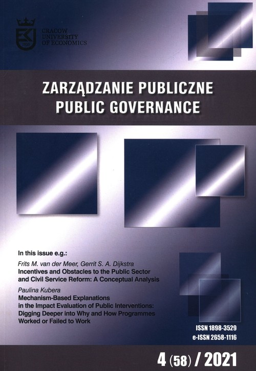 Incentives and Obstacles to the Public Sector and Civil Service Reform: A Conceptual Analysis Mechanism-Based Explanations in the Impact Evaluation of Public Interventions: Digging Deeper into Why and How Programmes Worked or Failed to Work The Effects of Supporting Business Innovation and R&D Activities from European Union Funds in Poland: A Review of Evaluation Studies Sleep Disorders as a Safety Issue in Transport and Communication Largely Not Appraised by National Health Policies Policy Towards the 'Auditorium Sector' in Poland in the First Year of the COVID-19 Pandemic: Mechanisms of Restrictions and Support with Public Funds, Including State Aid