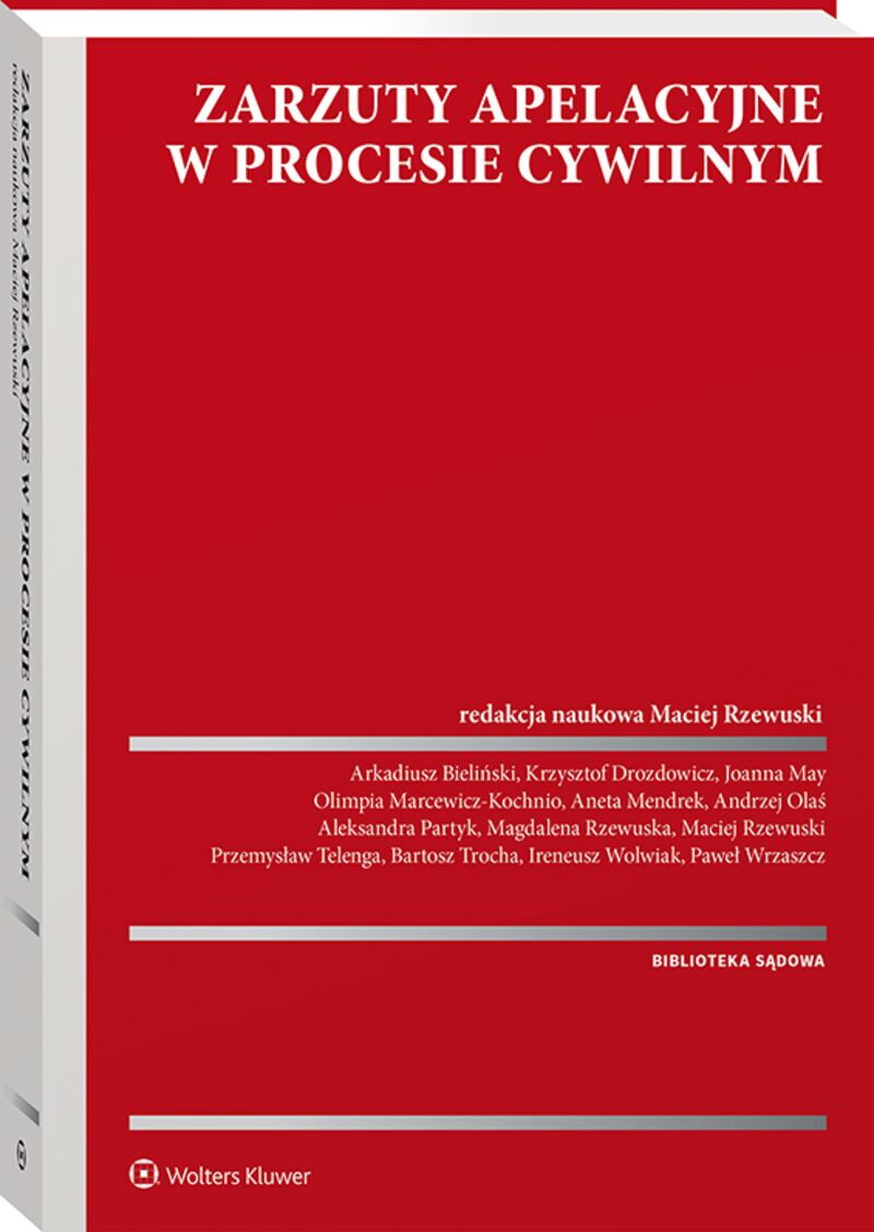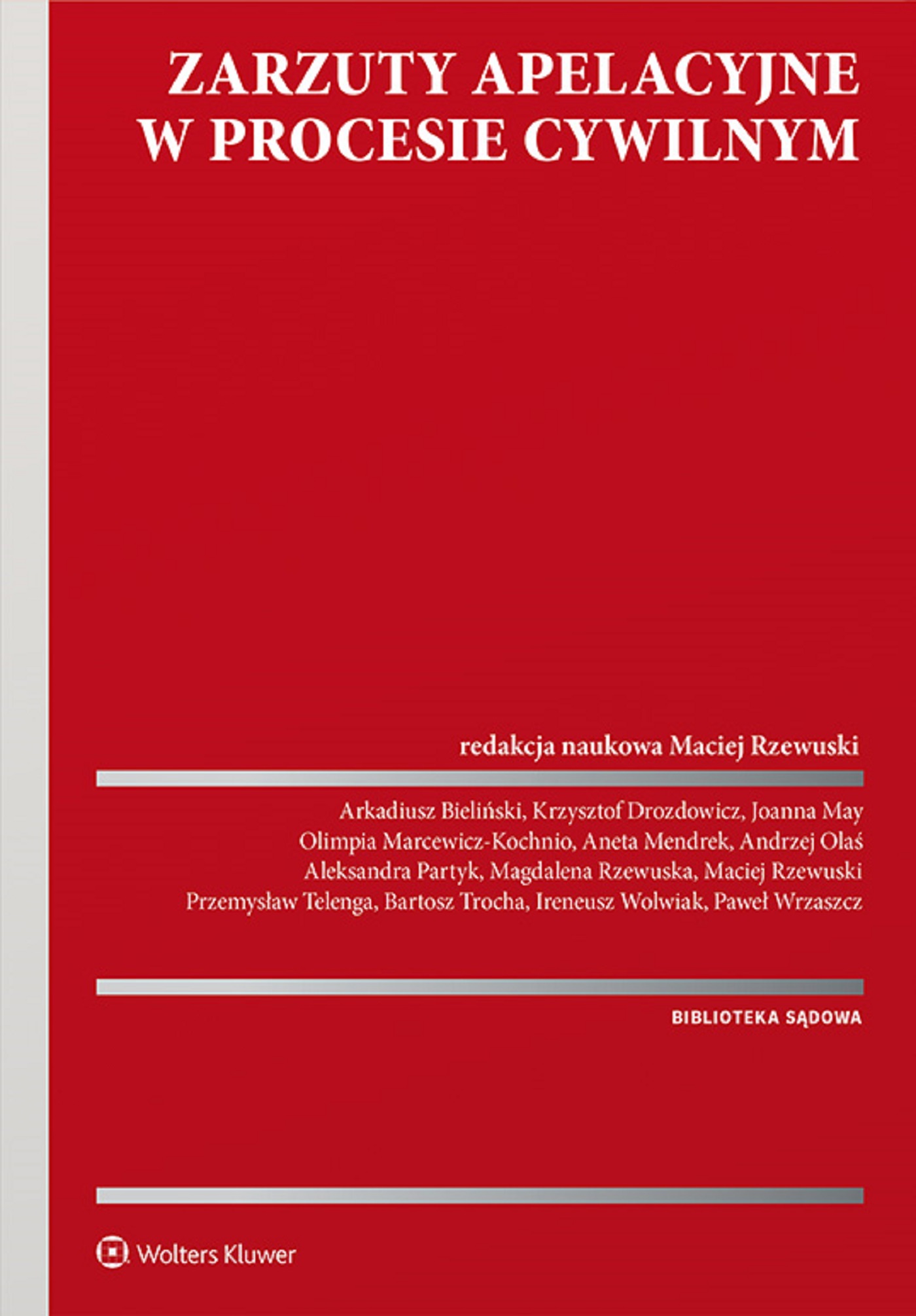 Książka stanowi kompendium wiedzy na temat możliwości i sposobów korzystania z procesowo dopuszczalnych środków obrony przed niekorzystnymi skutkami wyroku wydanego przez sąd pierwszej instancji. W książce przedstawiono zarzuty, które są charakterystyczne dla procesu odwoławczego. Świadomie pominięto te zarzuty materialnoprawne, procesowe i mieszane, które mogą być skutecznie podnoszone już na etapie procesu pierwszoinstancyjnego. W kolejnych rozdziałach autorzy omówili zarzuty: • błędnego ustalenia stanu faktycznego sprawy, • niewłaściwego zastosowania lub niezastosowania prawa materialnego, • błędnej wykładni prawa materialnego, • błędnej wykładni oświadczenia woli, • wadliwego rozłożenia ciężaru dowodów, • naruszenia przepisów postępowania, • uchybienia regułom prekluzji dowodowej, • naruszenia zasady swobodnej oceny dowodów, • braku interesu prawnego w zaskarżeniu orzeczenia, • wadliwego uzasadnienia zaskarżonego orzeczenia, • nierozpoznania istoty sprawy, • nieważności postępowania. Od przyjętej strategii odwoławczej stron procesowych zależy zarówno czas trwania i przebieg postępowania drugoinstancyjnego, jak i efekt końcowy w postaci rozstrzygnięcia sądu odwoławczego. Prawidłowe zredagowanie zarzutu apelacyjnego może zapewnić skarżącemu sukces, książka więc będzie przydatna pełnomocnikom procesowym. Umiejętność prawidłowego odczytania zarzutu i oceny jego zasadności to cecha, która powinna wyróżniać rzetelnych sędziów, referendarzy sądowych oraz ich pomocników, tj. asystentów. Książka jest głosem praktyków: sędziów, adwokatów, radców prawnych, i teoretyków prawa z uznanych ośrodków naukowych w kraju w sprawach dotyczących charakteru i wymiaru zarzutów apelacyjnych w postępowaniu cywilnym.