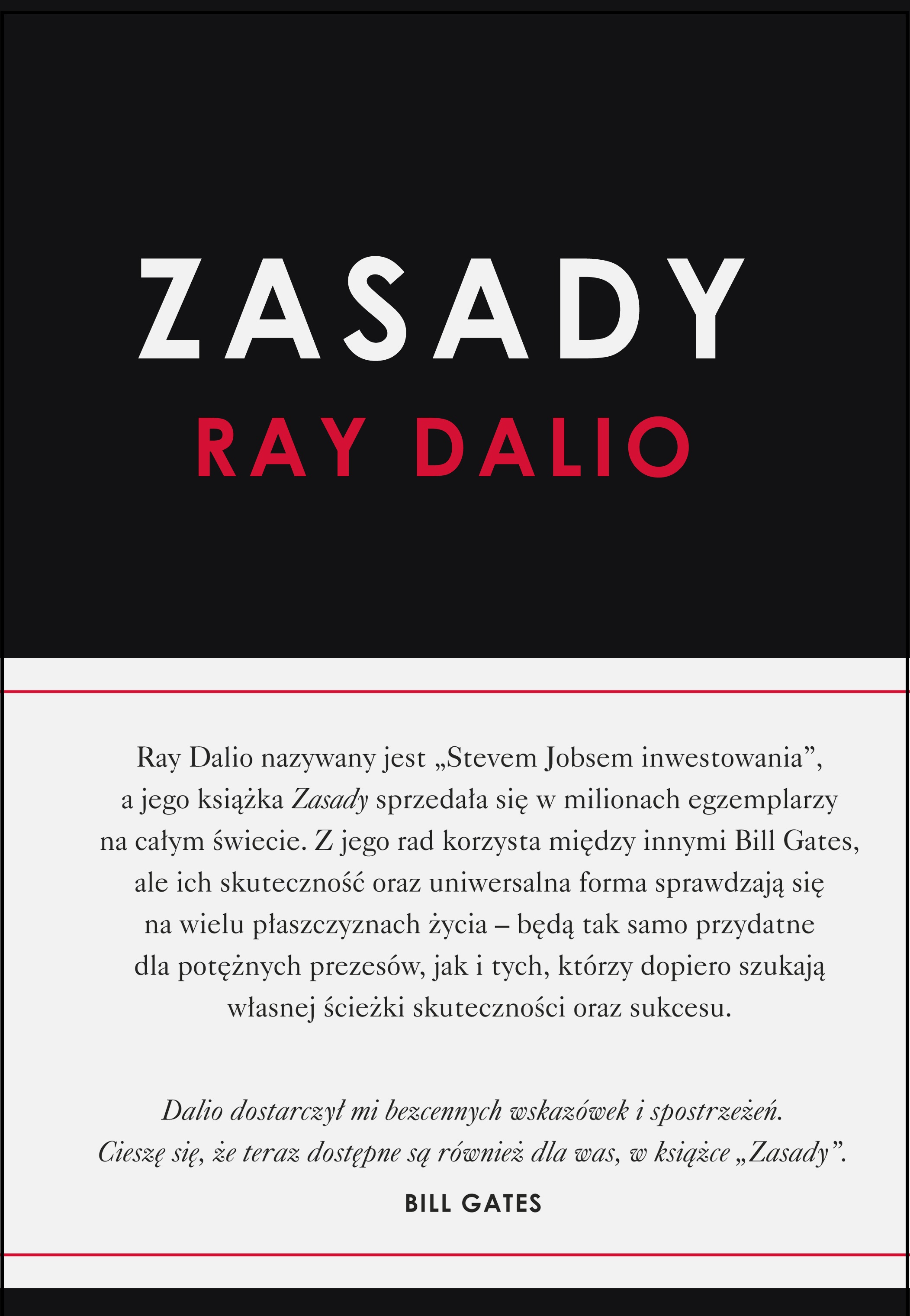 Ray Dalio dostarczył mi bezcennych wskazówek i spostrzeżeń. Cieszę się, że teraz dostępne są również dla was, w książce Zasady. - Bill Gates