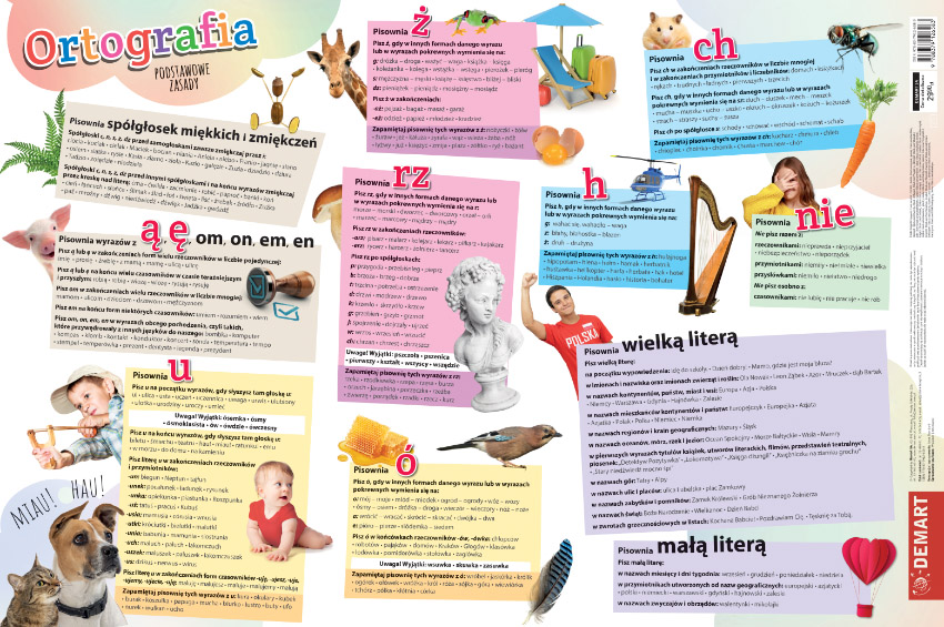 Ortografia zawsze pod ręką! Podkładka na biurko "Ortografia. Podstawowe zasady" To zbiór najważniejszych zasad i reguł ortograficznych, które dzieci poznają w trakcie edukacji wczesnoszkolnej. Każda zasada jest opatrzona przykładami, które pozwalają na szybsze i skuteczniejsze jej opanowanie. Realistyczne zdjęcia uatrakcyjniają przyswajanie zasad ortograficznych i zachęcają dzieci do pochylenia się nad podkładką i przedstawianymi na niej treściami. To nie tylko fantastyczna ozdoba, ale także świetna ochrona dziecięcego biurka. Podkładka od spodu ma warstwę gumowanej pianki, która dobrze stabilizuje ją na biurku. Wierzch pokryty przezroczystą matową folią pozwala zachować czystość miejsca pracy i zabawy Twojego dziecka. Podkładkę wystarczy przetrzeć zwilżoną, miękką ściereczką i wygląda jak nowa!