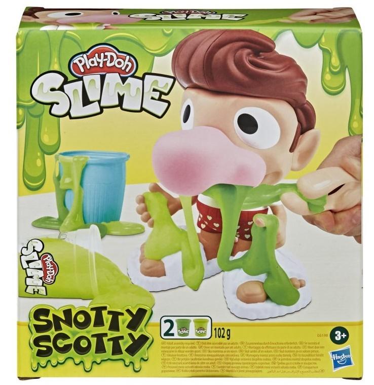 Zasmarkany Scotty. Czy miałeś kiedyś taki dzień, w którym po prostu musiałeś zostać w domu w wygodnym ubraniu i kapciach? Z pewnością tak! Niezależnie od tego, czy jest to sezon alergiczny, czy zwykłe przeziębienie, temu chłopcu przydałaby się pomoc z katarem. Poznaj zasmarkanego Scotty'ego, włóż trochę masy Play-Doh Slime do głowy figurki, następnie naciśnij czubek jego głowy i spraw, aby slime kapał mu z nosa. Zabawne jest również ściskanie jego dużego, miękkiego nosa, aby slime płynął lub użyj przezabawnej pęsety w kształcie palców, aby wyciągnąć te smarkate rakiety. Zestaw zawiera również kosz na śmieci, który pomaga zasmarkanemu Scotty'emu posprzątać po sobie.